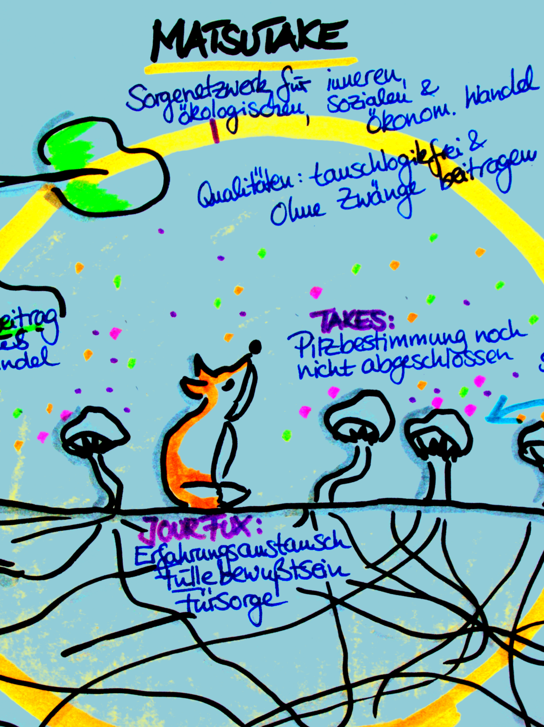Der Jour Fux ist der Treffpunkt der Takes. Einmal im Monat sehen wir uns in Untergruppen von maximal 10 Personen, in der Regel online. Hier tauschen wir aus, wie es uns geht, teilen unsere Erfahrungen, forschen an unserer Beziehung zum Geld: Wie ist es für uns, tauschlogikfrei tätig zu sein, etwas ohne Gegenleistung zu geben, zu bekommen? Wo entsteht Unsicherheit, Freude, Trauer, Wut oder Scham? Wo entsteht Fülle? Beim Jour Fux sind wir emotional fürsorgliche Weggefährt*innen und Spielkamerad*innen füreinander, und auch materielle Fürsorge hat hier Platz: Hier treffen wir uns auch zum Umverteilen. Im Moment machen wir das so: Zuerst gibt es die „Hab ich übrig“-Runde. Wer mehr hat, als sie*er gerade zum Leben braucht, entscheidet selbst, wie viel sie*er davon in den Topf legt (in dem auch die neu eingegangenen Spenden aus dem Myzel liegen, vielleicht ja auch von dir). Dann folgt die „Ich brauche“-Runde: Wer zu wenig zum Leben hat, kann Bedarf anmelden. Dabei entscheidet jede*r selbst, wie viel sie*er braucht. Wir schauen gemeinsam, wie viel Geld im Topf ist. Ist genug für alle Bedarfe im Topf, ist das entspannend und auch ein kleines Wunder. Wenn es nicht komplett ausreicht, bekommen die, die etwas benötigen, anteilig von dem, was da ist.